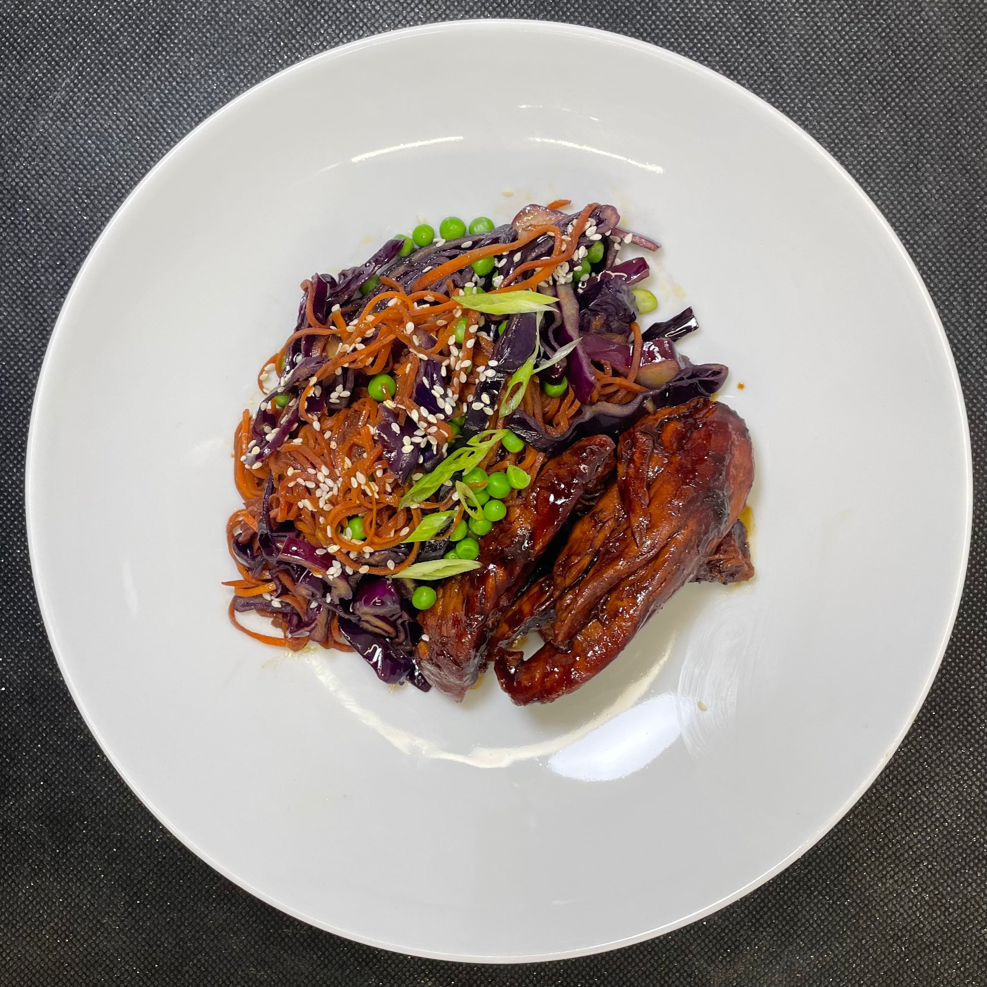 Poêlée asiatique de maïs, carottes, petits pois, chou rouge et huile de sésame.