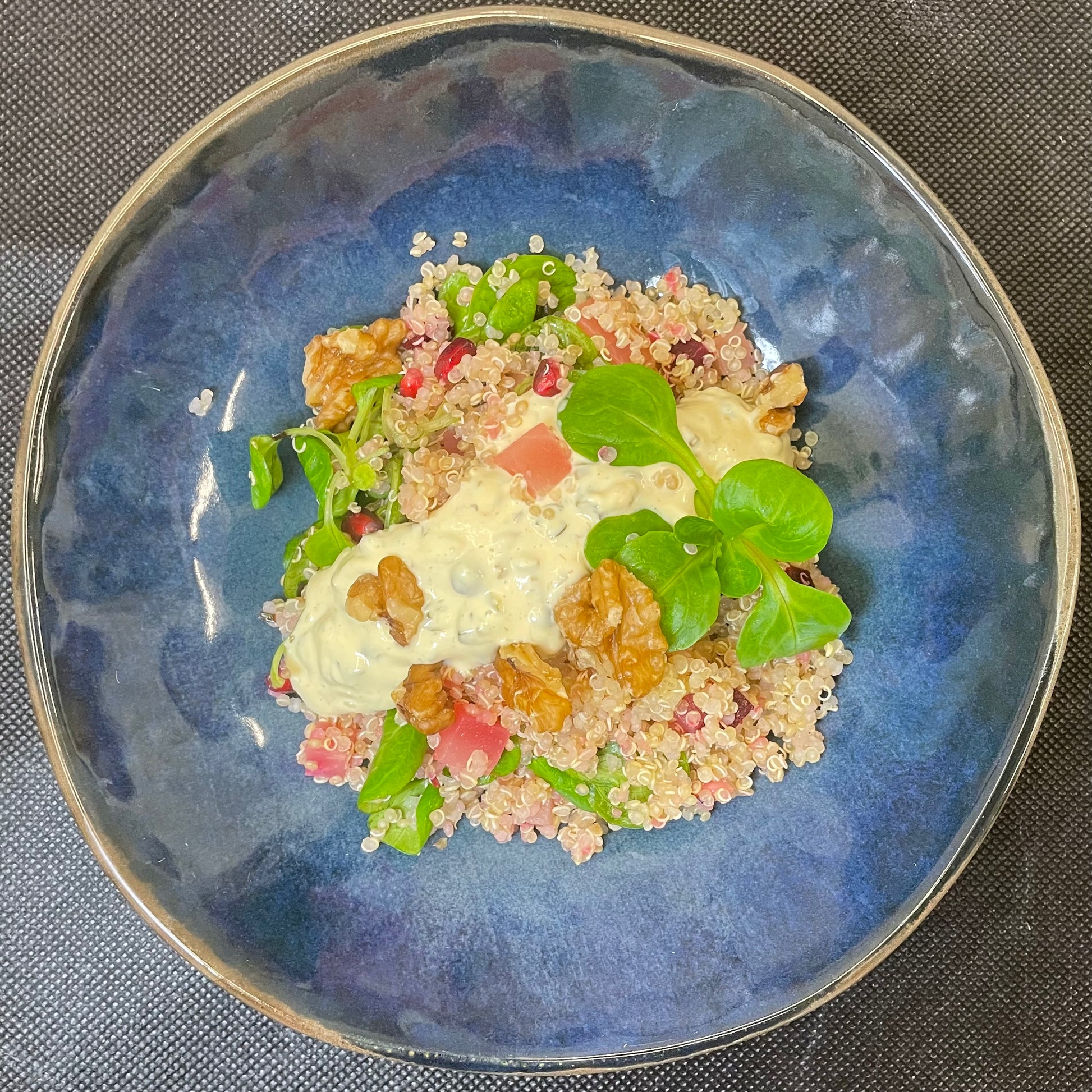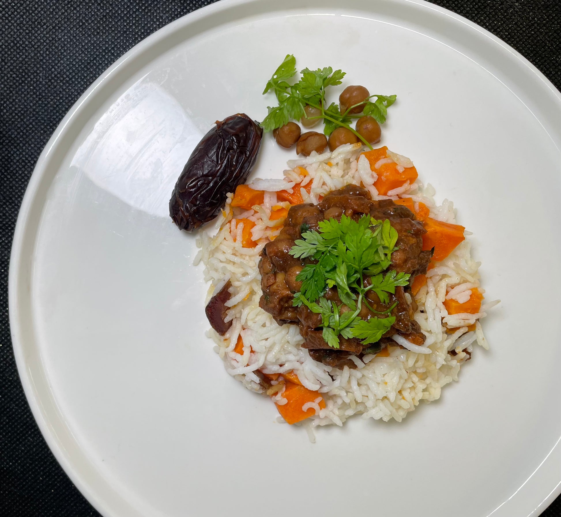 Pois chiches noirs en sauce, écrasé de courge et dattes, riz long grain